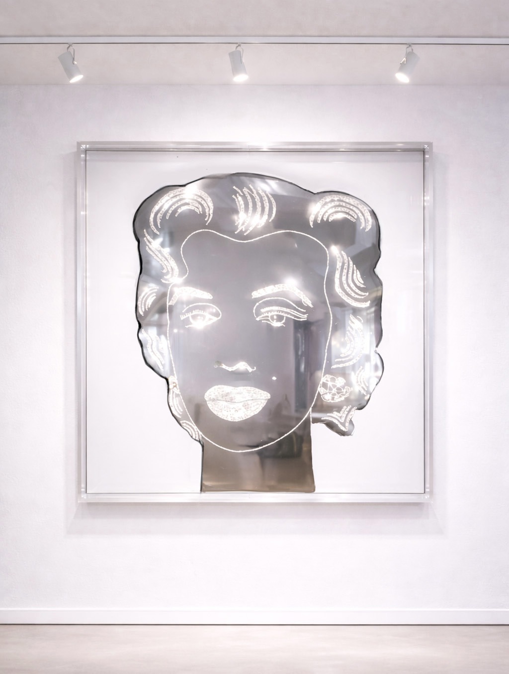 “ Monroes 10.000 crystals”, is a unique piece of the silver crystals collection. It is made from the materials, Highly reflective sustainable material, acrylic paint, fabric, Swarovski crystals and handmade luxury acrylic frame.