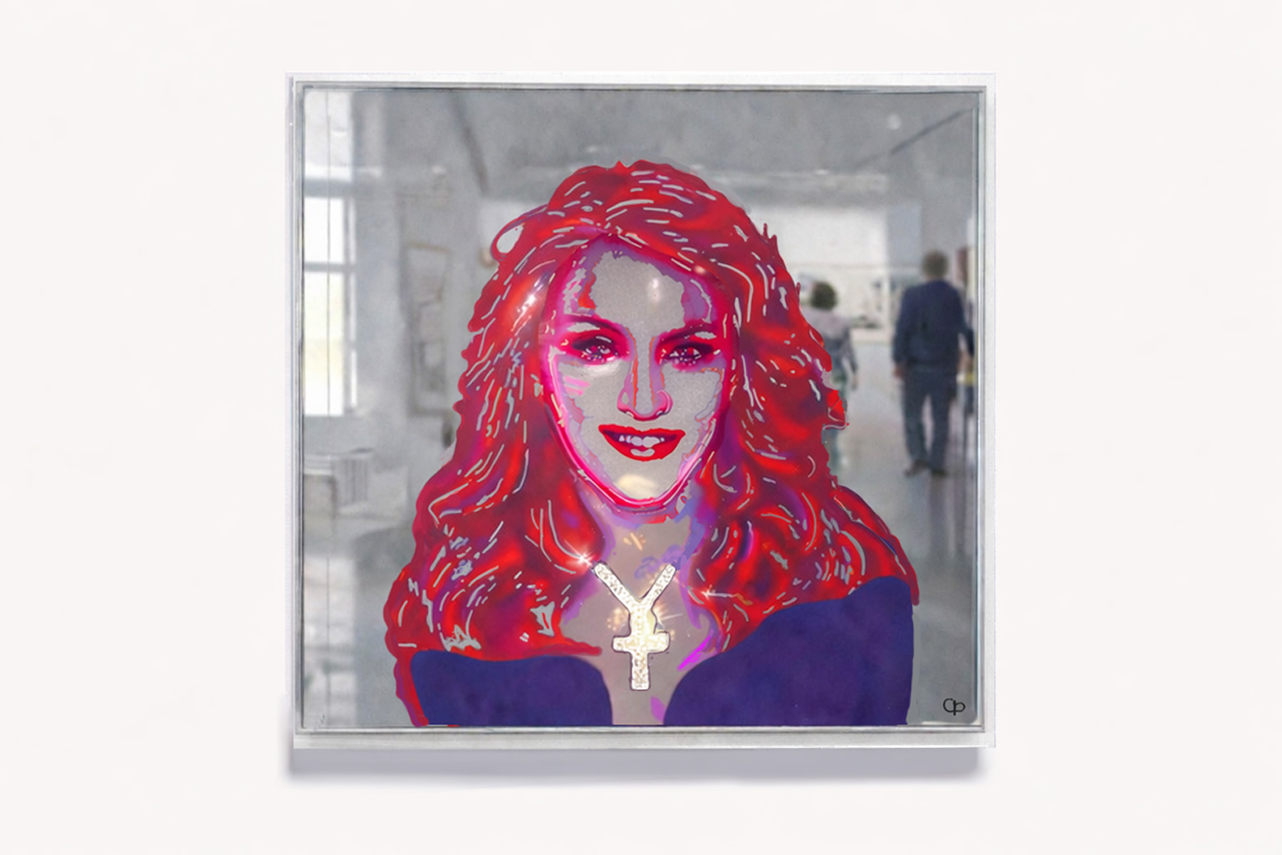 Featuring iconic symbolism, tailor-made couture, and a Swarovski crystal cross necklace, the work expresses femininity, strength, and modern luxury, and is finished with a handmade acrylic frame.